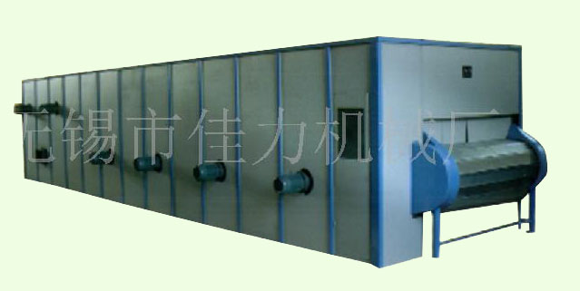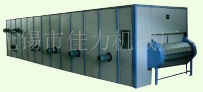 该机有机架、风扇、运毛帘、加热器等组合而成,机架系由槽钢、角钢等组成,分成主室与侧室两部分,用钢板隔离,主室安装输送帘板、加热器及隔风板等,侧室安装风机、风导、调速电机及减速器。为防止热量散失,四周板壁中装有隔热材料,主室装有可开启的门便于维修。顶部有两个开口排气孔使湿空气排出机外,接口处有活动调节装置,以调节排湿量。另有长方口一调节风量。(据客户要求,也可以安装排湿风机,进行对外排出湿空气。)