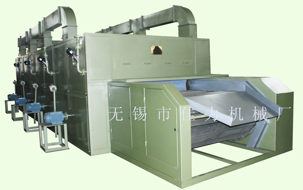 该机有机架、风扇、运毛帘、加热器等组合而成,机架系由槽钢、角钢等组成,分成主室与侧室两部分,用钢板隔离,主室安装输送帘板、加热器及隔风板等,侧室安装风机、风导、调速电机及减速器。为防止热量散失,四周板壁中装有隔热材料,主室装有可坼卸的多块小门板便于维修。各式顶部有两个开口排气孔,把它们连在一起把湿空气排出机外,每个接口处装有活动调节装置,以调节排湿量。(据客户要求,也可以安装排湿风机,进行对外排出湿空气。)